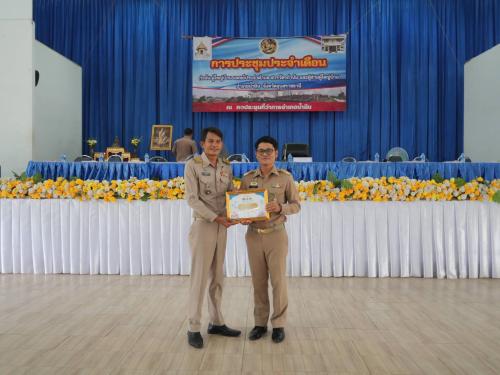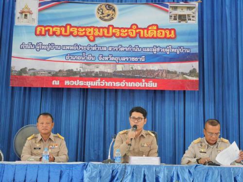 นายสมชัย ริทัศน์โส ปลัดอำเภอ (จพง.ปค.ชำนาญการพิเศษ) รักษาราชการแทนนายอำเภอน้ำยืน เป็นประธานในการประชุมประจำเดือน กำนัน/ผู้ใหญ่บ้านฯลฯ ประจำเดือนตุลาคม 2568 ร่วมกับหัวหน้าส่วนราชการต่าง ๆ ในอำเภอน้ำยืน เพื่อแจ้งชี้แจงข้อราชการที่สำคัญ โดยก่อนวาระประชุม มีพิธีมอบเกียรติบัตรยกย่องและเชิดชูเกียรติกองทุนแม่ของแผ่นดิน รางวัลรองชนะเลิศอันดับ 2 กิจกรรมการประกวดหมู่บ้านกองทุนแม่ของแผ่นดิน ประจำปี 2568 ระดับจังหวัด ได้แก่ บ้านหนองเต็ง หมู่ที่ 8 ตำบลเก่าขาม อำเภอน้ำยืน จังหวัดอุบลราชธานี